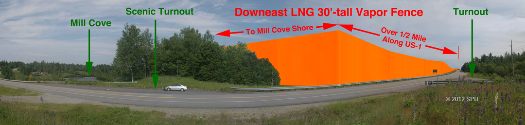 In attempting to solve that problem, Downeast LNG is now proposing to build 20-foot-tall Vapor Fences along the property fence line — including along the entire US-1 property line, along the proposed terminal's southern boundary, and along a short portion of the Mill Cove shoreline. There would also be other concentric vapor fences inside the fence line.