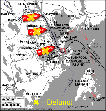 Split Rock site defunct — Quoddy Bay LNG's second proposed site (see Gleason Cove proposed site map, below). Quoddy Bay LNG evicted from federal permitting by FERC after failing to answer FERC's technical questions for one year; lease cancelled by Passamaquoddy Tribal Government & US Department of Interior Bureau of Indian Affairs (BIA).