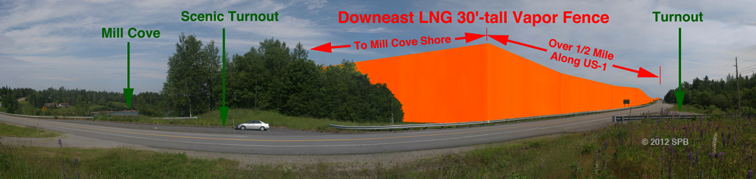 Photosimulation of proposed Downeast LNG 30-ft-high vapor barrier along Highway US-1, and adjacent to State of Maine Scenic Turnouts.