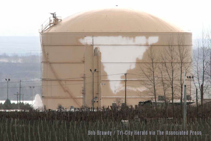 LNG leaking out of the bottom of the tank through a pipe of less than one inch in diameter was stopped Tuesday afternoon when crews were able to shut off a valve, Benton County District Fire Chief Rolland Watts said. Vaporized gas was still leaking from a gash in the outer wall of the 1.2 billion cubic foot storage tank, and blowing away on the wind, presenting little danger. Major piping is all underground and was not damaged. [Red, yellow & bold emphasis added.]
